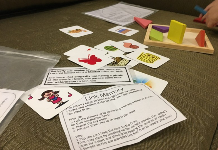Besides attending right brain training sessions, parents can partake in simple right brain activities at home with your kids too. The key to right brain activities is the fast speed technique which engages young kids while developing their focus. Have fun playing together!